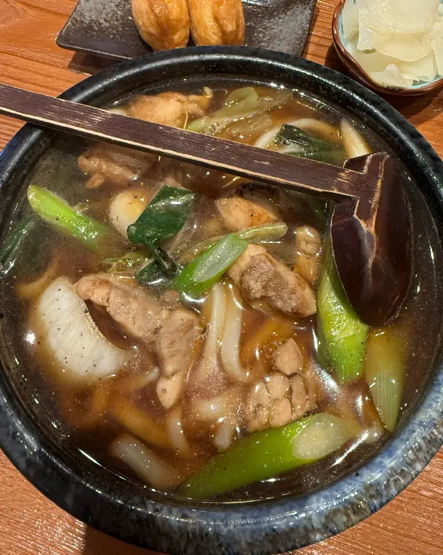 주문을 마치고 가게를 찬찬히 둘러봤다. 테이블마다 놓인 나무 국자가 왠지 모르게 정겹다. 따뜻한 물을 마시며 기다리는 동안, 배달 주문이 계속 들어오는 걸 보니 역시 요즘 같은 날씨에는 따뜻한 국물 요리가 인기인가 보다. 잠시 후, 김이 모락모락 나는 지도리우동이 눈 앞에 놓였다. 검은색 뚝배기 그릇에 담겨 나온 우동은 보기만 해도 속이 따뜻해지는 기분이었다. 큼지막하게 썰린 대파와 닭고기가 면 위에 푸짐하게 올려져 있었다.
