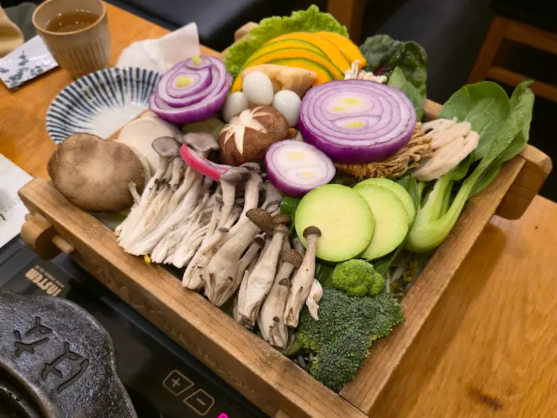 가장 먼저 눈길을 사로잡은 것은 바로 신선한 채소 한가득 담긴 나무 상자였다. 브로콜리, 연근, 호박, 버섯, 쌈채소 등 형형색색의 채소들이 정갈하게 담겨 나왔다. 마치 예술 작품을 보는 듯한 느낌이었다. 채소의 신선함이 그대로 느껴져 빨리 맛보고 싶어졌다. 사진 속 채소들은 하나같이 싱싱했고, 특히 보라색 양파의 선명한 색감이 인상적이었다.