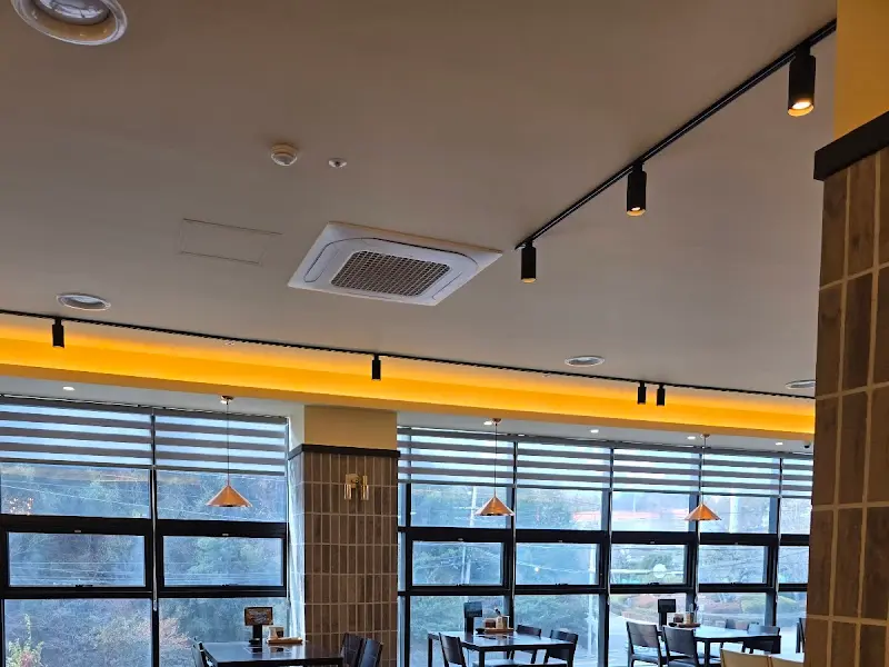 넓은 주차장에 도착하니, 친절한 주차 요원분께서 반갑게 맞아주셨다. 첫인상부터 기분이 좋아지는 곳이었다. 매장 문을 열고 들어서자, 생각보다 훨씬 넓고 깔끔한 공간이 눈에 들어왔다. 높은 천장과 은은한 조명, 그리고 테이블 간 간격도 넉넉해서 편안하게 식사를 즐길 수 있을 것 같았다. 커다란 창밖으로는 여수 시청의 풍경이 한눈에 들어왔다. 창가 자리에 앉으니, 여행의 설렘이 더욱 커지는 듯했다. 천장에는 검은색 레일 조명이 줄지어 있었고, 넓은 창문으로는 햇살이 가득 들어왔다. 창밖 풍경을 바라보며 어떤 메뉴를 고를까 행복한 고민에 빠졌다.