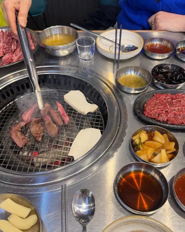 주문 후 얼마 지나지 않아, 테이블 위로 정갈한 밑반찬들이 차려졌다. 놋그릇에 담긴 반찬들은 하나하나 정성이 느껴졌고, 신선한 재료 본연의 맛을 살린 깔끔한 맛이 인상적이었다. 특히, 직접 담근 듯한 무생채는 아삭한 식감과 시원한 맛이 일품이었다. 밑반찬을 맛보는 사이, 드디어 기다리고 기다리던 한우 암소가 등장했다. 선홍빛 육질에 섬세하게 박힌 마블링은 보는 것만으로도 감탄을 자아냈다. 마치 붉은 보석을 보는 듯한 황홀한 자태에, 아이들도 “와!” 하며 탄성을 질렀다.