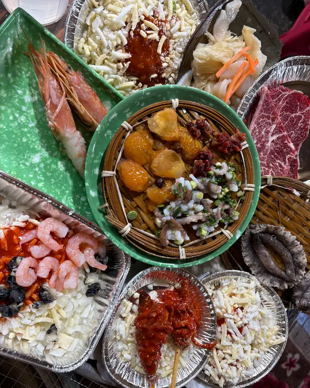 특히 시선을 사로잡은 것은 중앙에 자리 잡은 해산물 바구니였다. 멍게의 싱그러운 주황색, 쭈꾸미의 뽀얀 흰색, 해삼의 검은 빛깔이 조화롭게 어우러져 마치 예술 작품을 보는 듯했다. 곁들여진 쪽파의 푸릇함은 싱싱함을 더했고, 참기름의 고소한 향은 식욕을 자극했다.