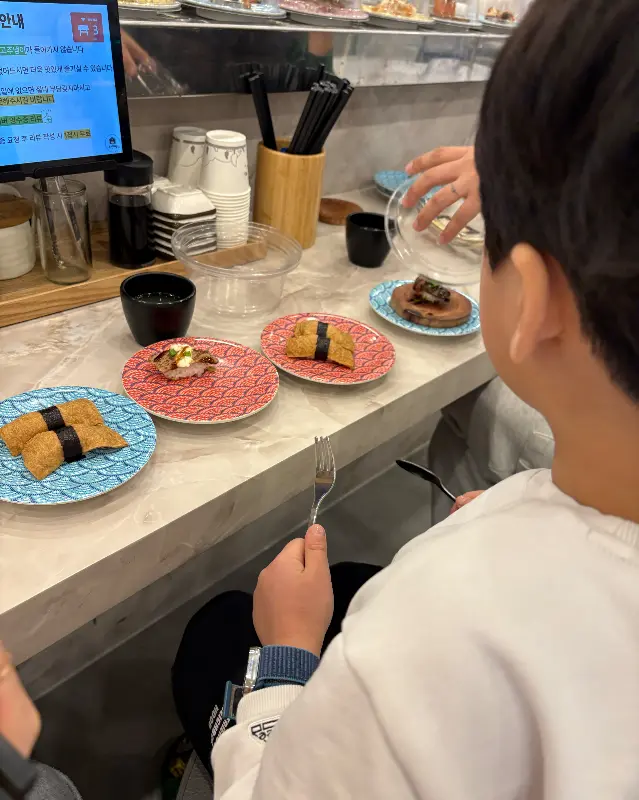 가게에 들어서자 넓고 쾌적한 공간이 눈에 띄었다. 테이블 간 간격도 넉넉해서 편안하게 식사를 즐길 수 있을 것 같았다. 레일을 따라 형형색색의 초밥들이 끊임없이 움직이는 모습은 마치 작은 축제 같았다. 시각적인 즐거움에 더해 신선한 재료에서 풍기는 은은한 바다 내음은 나의 후각을 자극하며 식욕을 더욱 끌어올렸다. 직원분들의 활기찬 인사와 친절한 안내는 첫인상을 더욱 긍정적으로 만들어주었다.