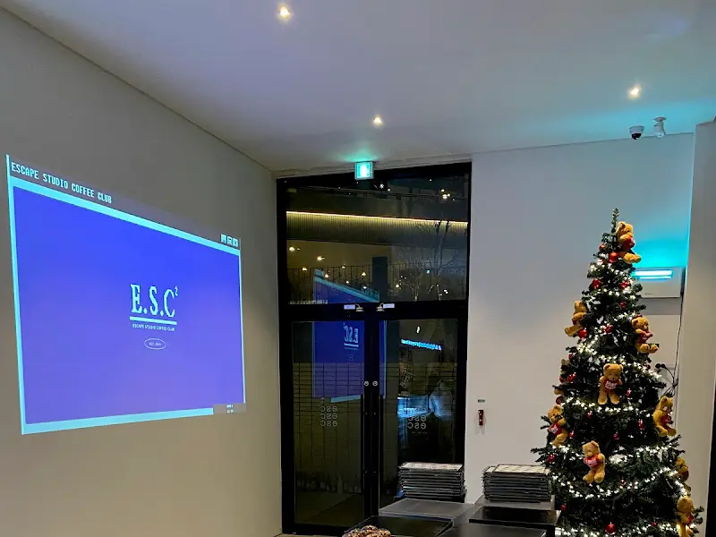 문을 열고 들어서자, 모던하면서도 감각적인 인테리어가 눈에 들어왔다. 높은 천장과 넓은 공간, 그리고 곳곳에 놓인 트렌디한 소품들이 ESC2만의 독특한 분위기를 자아냈다. 특히, 입구에 들어서자마자 보이는 빔프로젝터 스크린이 인상적이었다. E.S.C라는 심플한 로고가 세련되게 나타났다 사라지는 모습이 마치 뉴진스의 뮤직비디오를 연상시키는 듯했다. 전체적으로 깔끔한 화이트톤의 인테리어에 푸른색 로고가 포인트 컬러로 사용되어 더욱 세련된 느낌을 주었다. 마치 잘 꾸며진 스튜디오에 들어온 듯한 기분이었다. 카페 내부에 엘리베이터가 설치되어 있다는 점도 마음에 들었다. 쟁반 가득 빵과 음료를 들고 계단을 오르내릴 걱정 없이 편안하게 이동할 수 있다는 점이 큰 장점으로 느껴졌다.