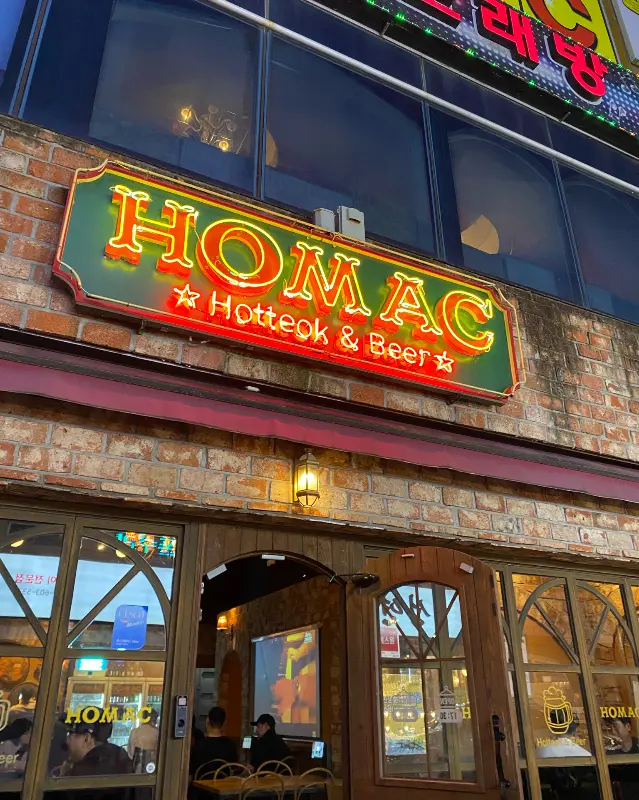 퇴근 후, 쏜살같이 달려 도착한 호맥. 멀리서부터 강렬한 네온사인 간판이 나를 반긴다. 붉은 벽돌 위에 큼지막하게 박힌 ‘HOMAC Hotteok & Beer’ 문구, 마치 뉴욕 뒷골목 힙합 클럽에 온 듯한 기분이다. 자동문을 스윽 열고 들어서니, 은은한 조명 아래 왁자지껄한 분위기가 온몸을 감싼다. 테이블마다 삼삼오오 모여 앉아 호떡에 맥주를 즐기는 사람들, 그 모습이 어찌나 평화롭고 힙하던지. 나도 모르게 어깨가 들썩거리는구만!