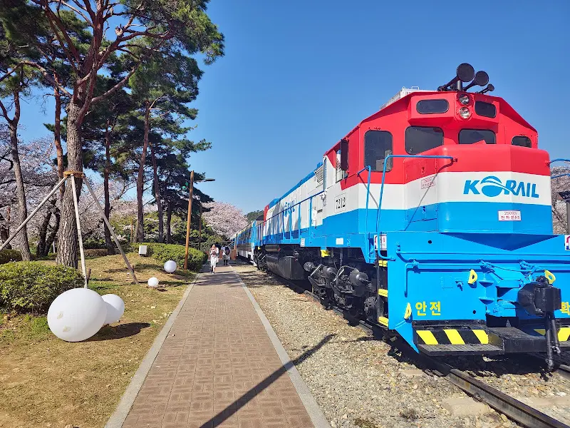 경화역에 도착하자, 낡은 간이역의 정취가 물씬 풍기는 풍경이 눈에 들어왔다. 붉은색과 푸른색이 칠해진 기차가 벚꽃나무 아래 놓여있는 모습은 마치 시간이 멈춘 듯한 느낌을 주었다. 기찻길 양옆으로는 벚꽃나무들이 줄지어 서 있었고, 그 사이로 사람들이 사진을 찍으며 추억을 남기고 있었다.