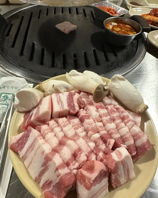 메뉴판 스캔 시작. 삼겹살, 갈매기살, 껍데기… 라인업이 장난 아니네. 고민 끝에, 시그니처 메뉴라는 삼겹살과 갈매기살, 그리고 궁금했던 쫄갈비까지 주문 완료. “사장님, 오늘 저 제대로 flex 해볼게요!” 주문 마치자마자, 밑반찬 세팅. 콩나물, 파김치, 쌈무… 하나하나 정갈하게 담겨 나온다. 특히 궁채 장아찌, 식감 깡패! 고기 나오기 전에 이미 밑반찬으로만 소주 한 병 각이다.