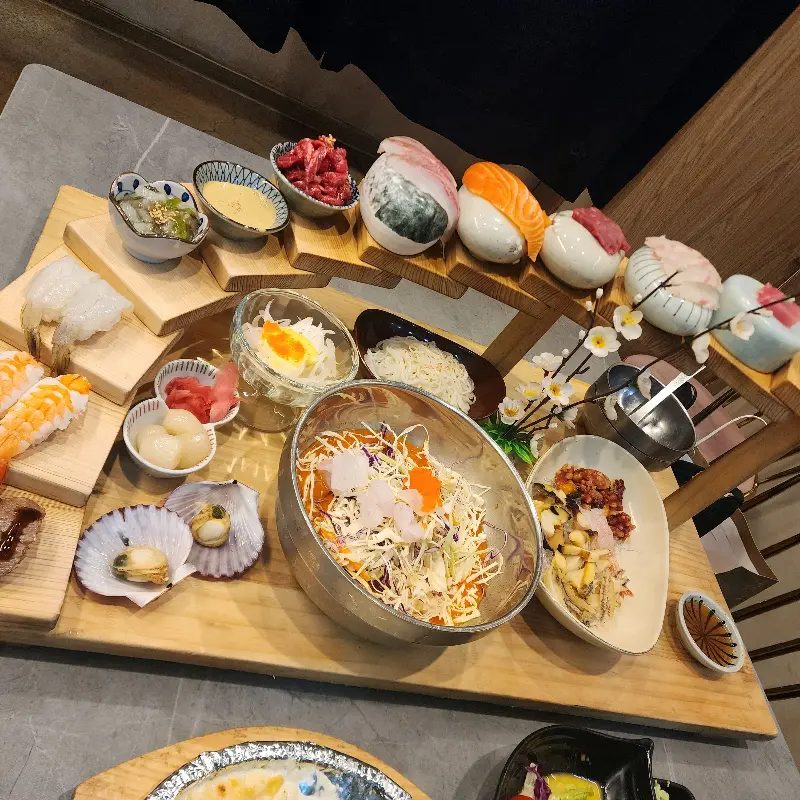 다음 타자는, 신선함이 살아 숨 쉬는 사시미! 🍣 도미, 연어, 광어… 보기만 해도 힐링 되는 비주얼이다. 특히, 층층이 쌓아 올린 사시미 플레이팅은 감탄을 자아낸다. 칼질 장인의 섬세한 손길이 느껴지는 듯. 신선한 사시미 한 점을 와사비 간장에 살짝 찍어 입에 넣으니, 찰진 식감과 함께 풍미가 폭발한다. Yo, 이 맛 실화냐?