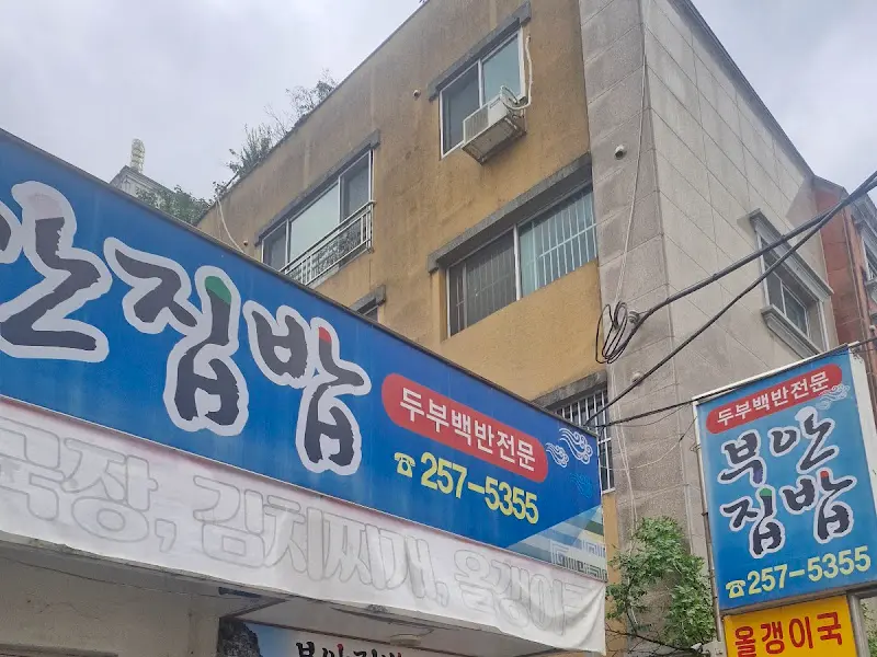 가게 앞에 딱 도착했는데, 간판부터 레트로 갬성 물씬. 파란 간판에 큼지막하게 적힌 “북만집밥” 네 글자가 힙하게 다가오네. 전화번호 257-5355, 왠지 삐삐 칠 뻔. 건물 외벽에는 손으로 그린 듯한 올갱이 그림이 뙇! 이런 숨겨진 디테일, 완전 내 스타일이지.