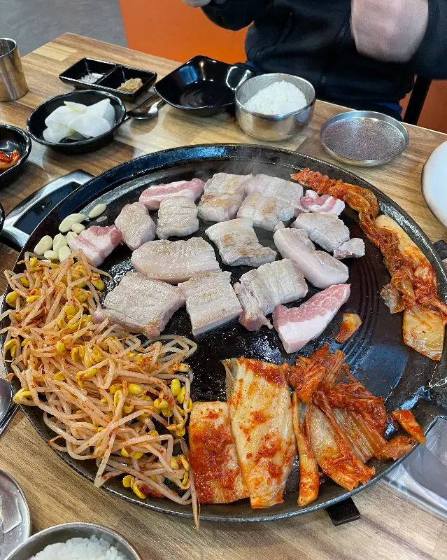 불판 위에서 삼겹살과 콩나물이 함께 구워지고 있는 모습