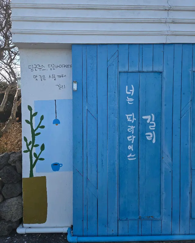 파란색 나무 문에 흰 글씨로 '너는 파라다이스 길리'라고 적혀 있는 카페 외부 모습